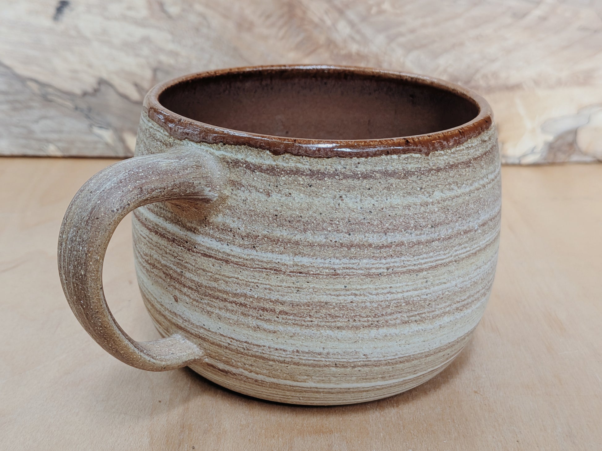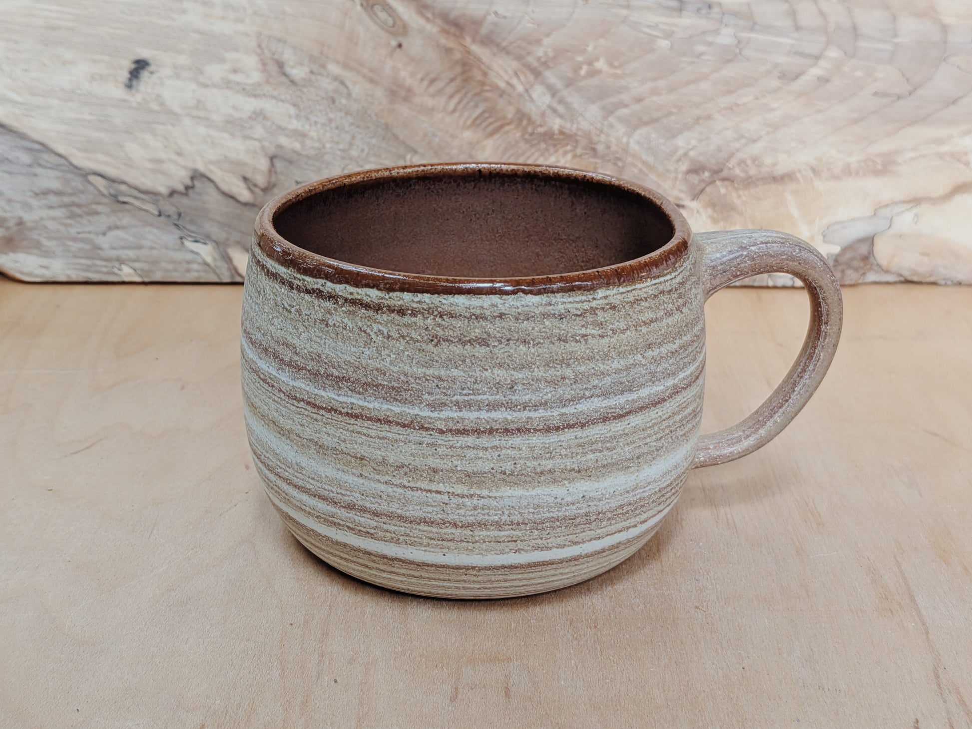 Made of a marbled mix of stoneware clay. The outside is left unglazed and the bare clay is sanded smooth, and the inside is glazed a glossy brick red.