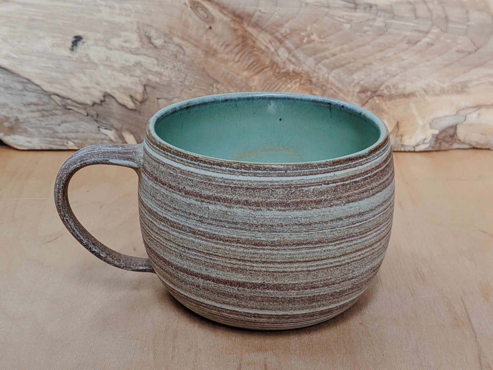 Made of a marbled mix of stoneware clay. The outside is left unglazed and the bare clay is sanded smooth, and the inside is glazed a minty green.