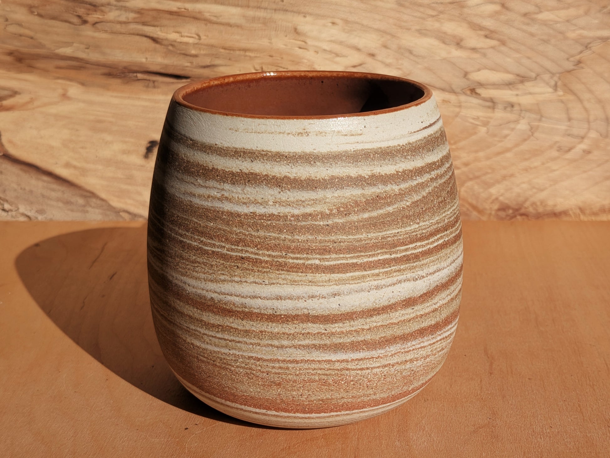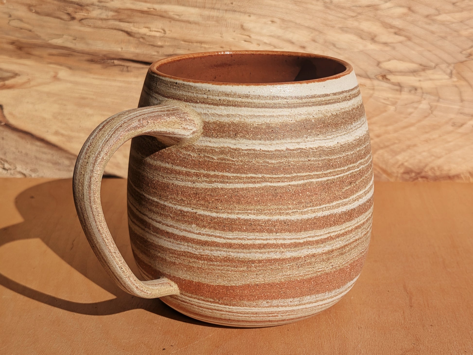 Made of a marbled mix of stoneware clay. The outside is left unglazed and the bare clay is sanded smooth, and the inside is glazed a glossy brick red.