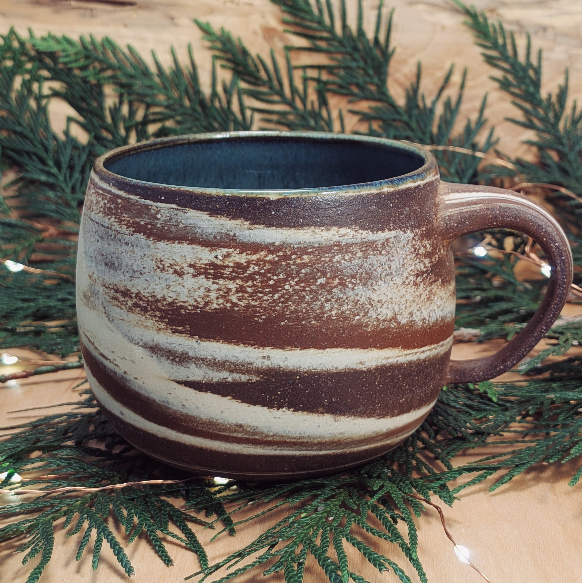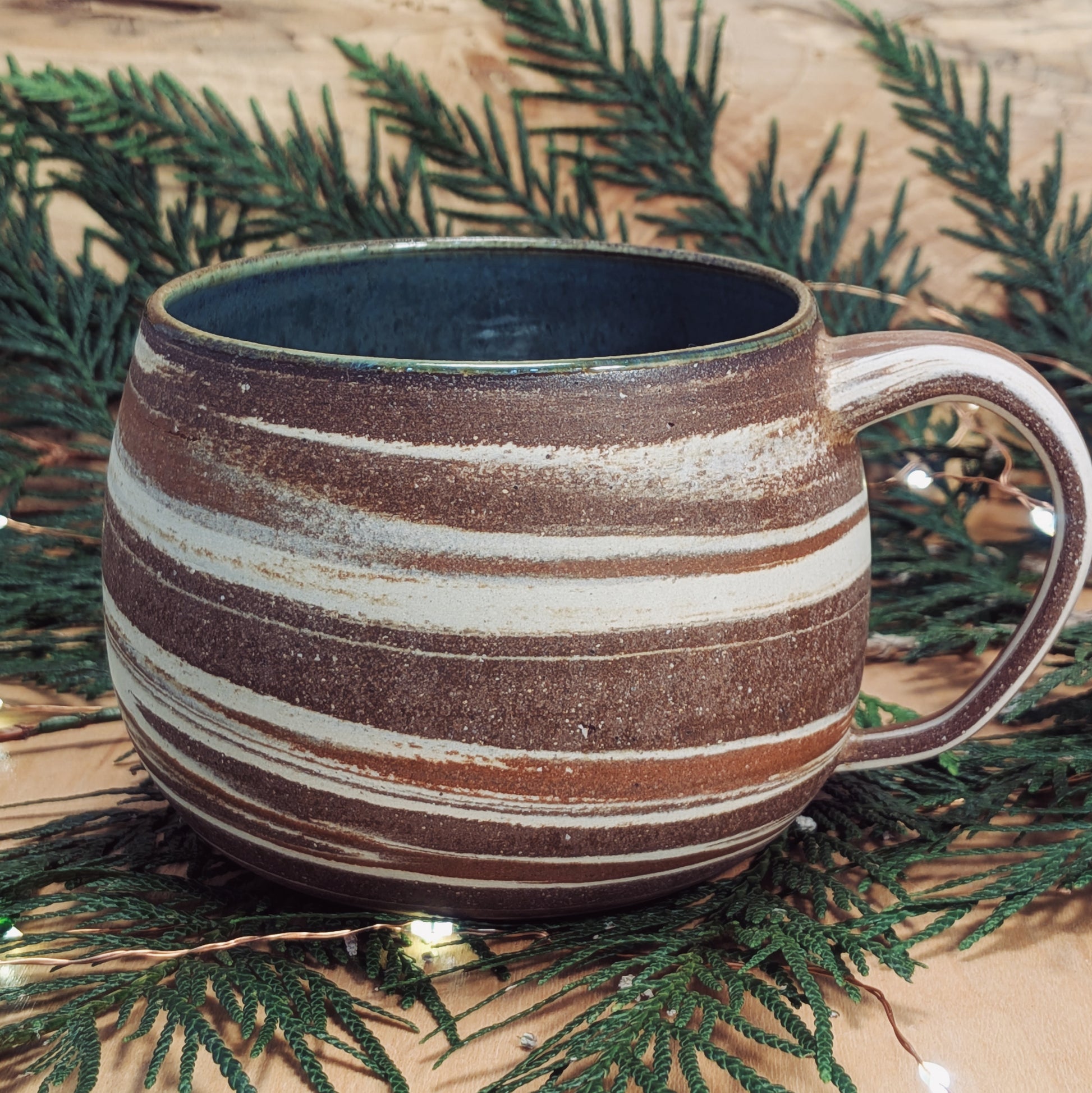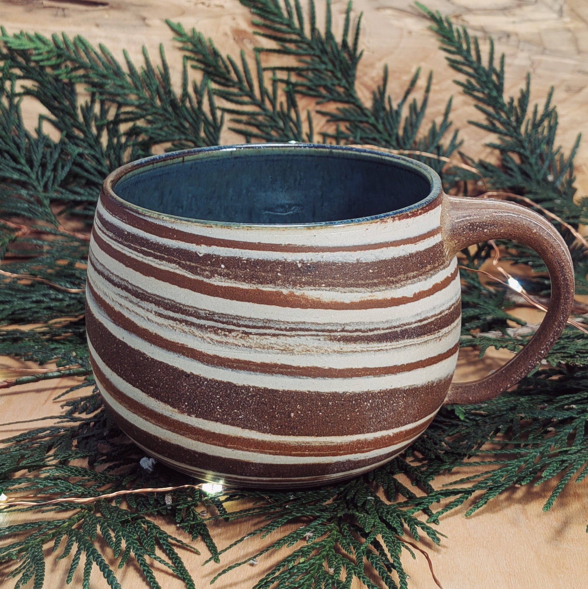 Made of a mix of stoneware clay, marbled together on the pottery wheel. Exterior is bare clay which has been burnished smooth and the interior is glazed an emerald green.