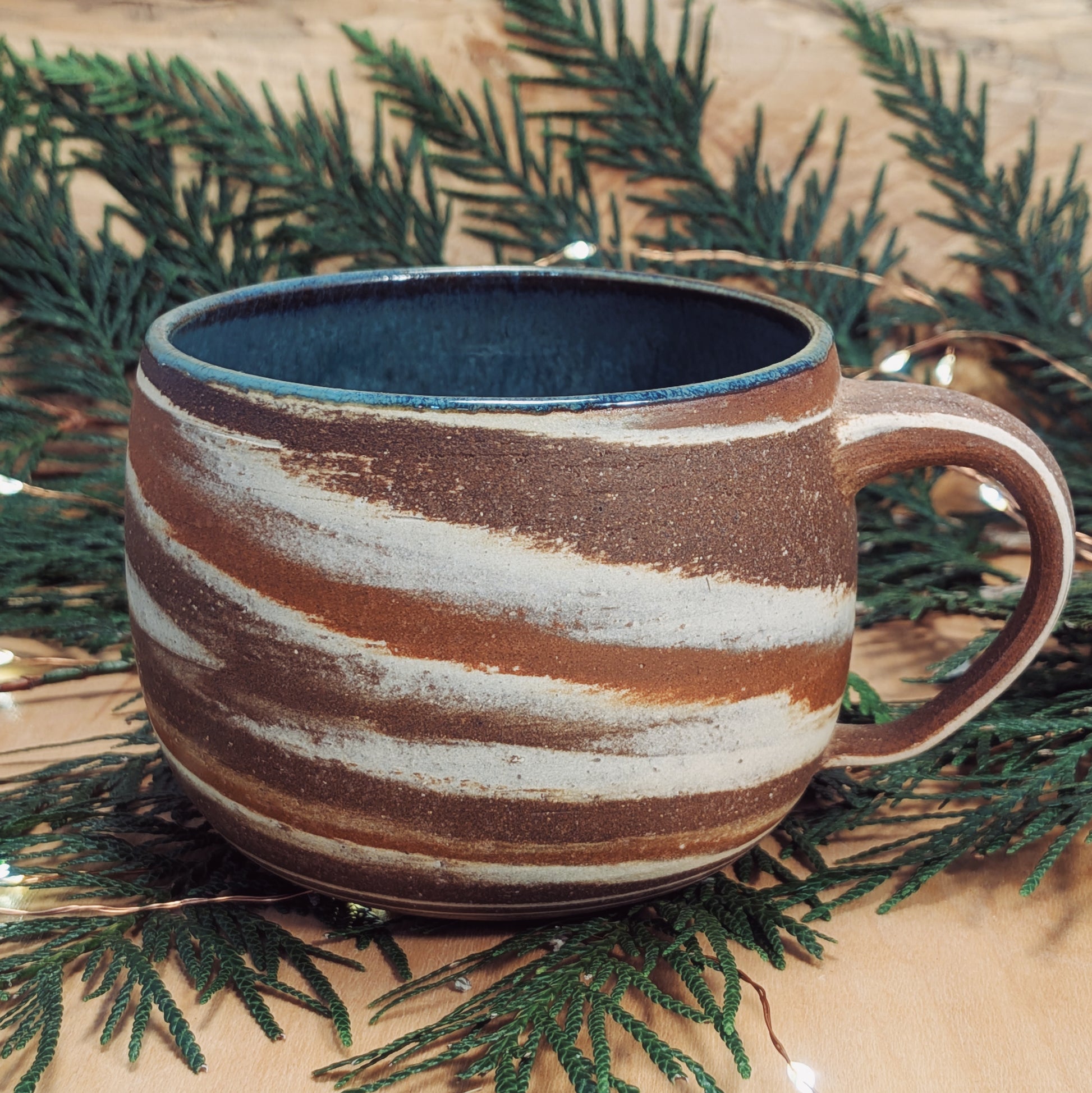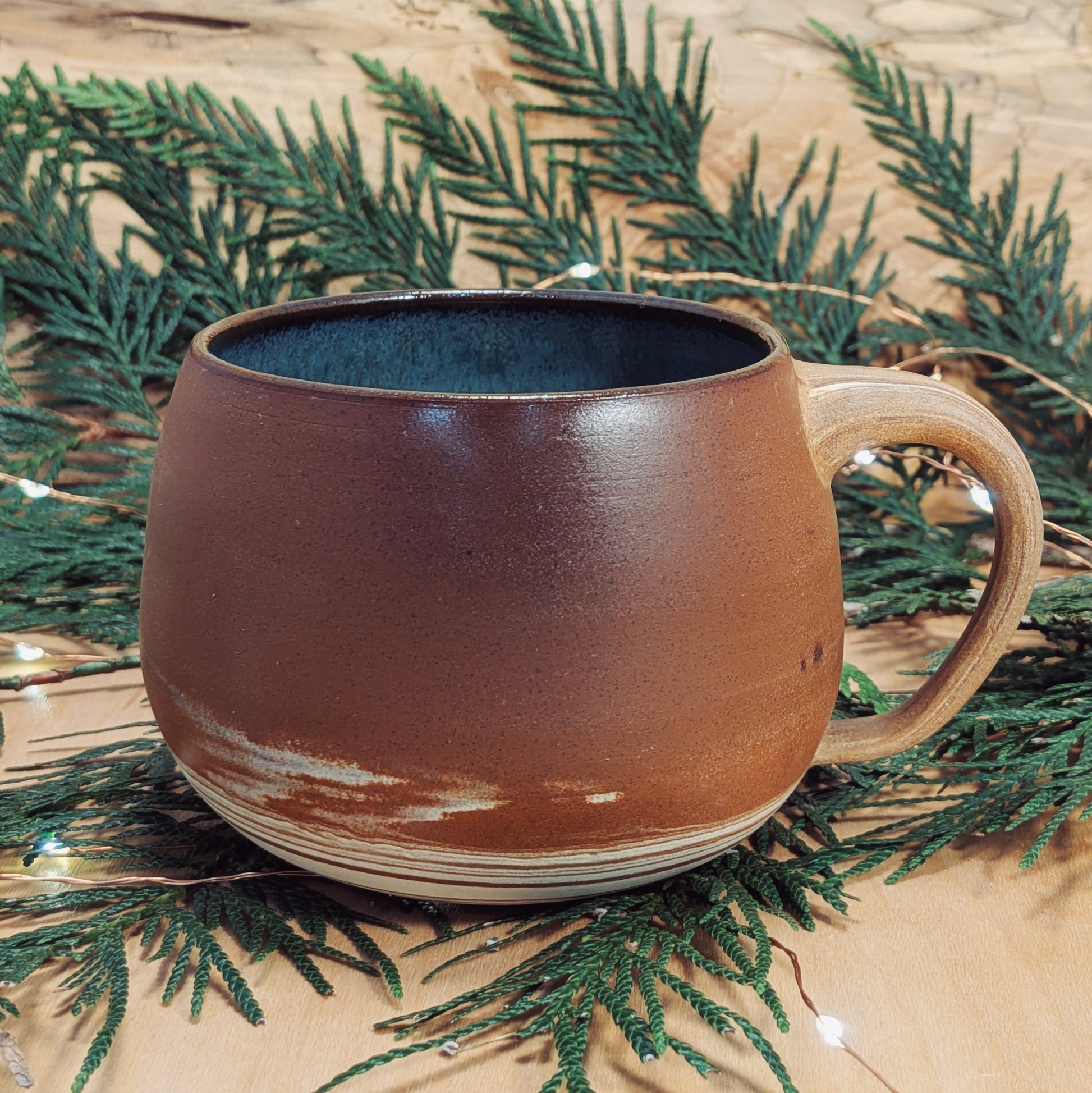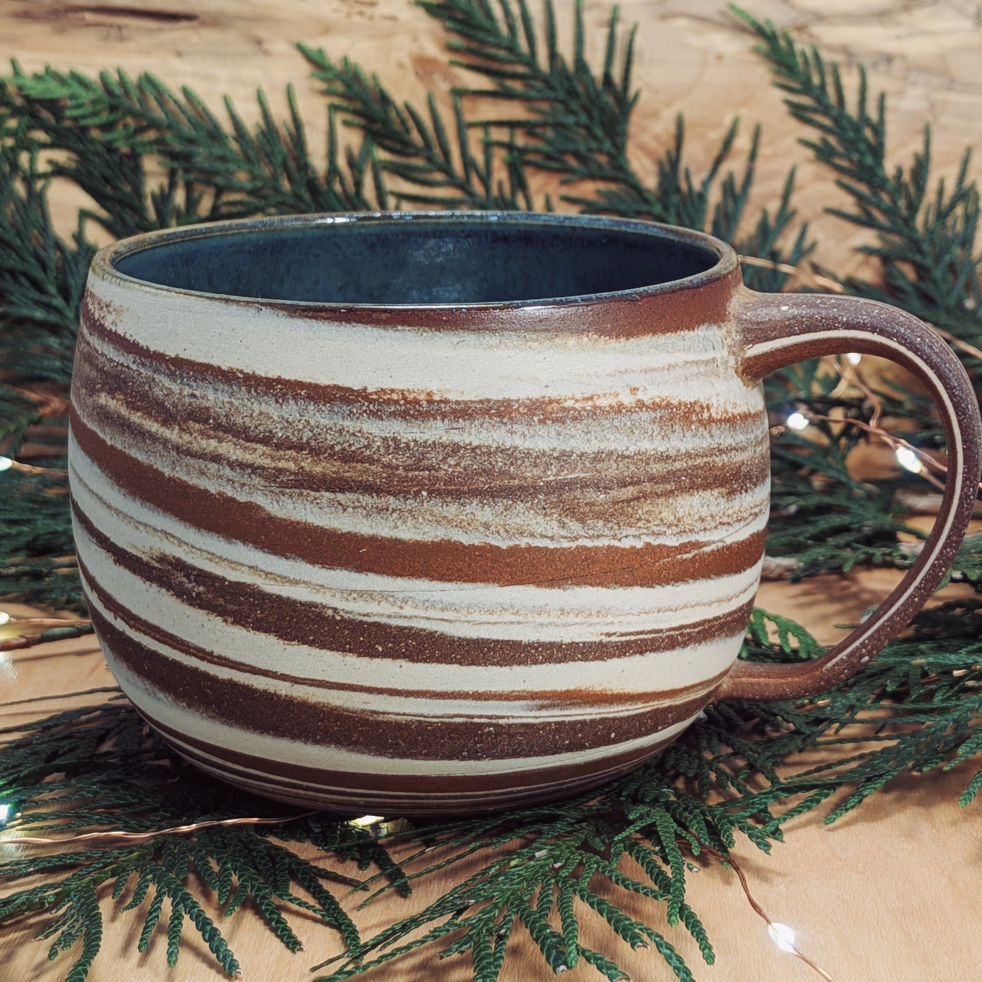 Made of a mix of stoneware clay, marbled together on the pottery wheel. Exterior is bare clay which has been burnished smooth and the interior is glazed an emerald green.