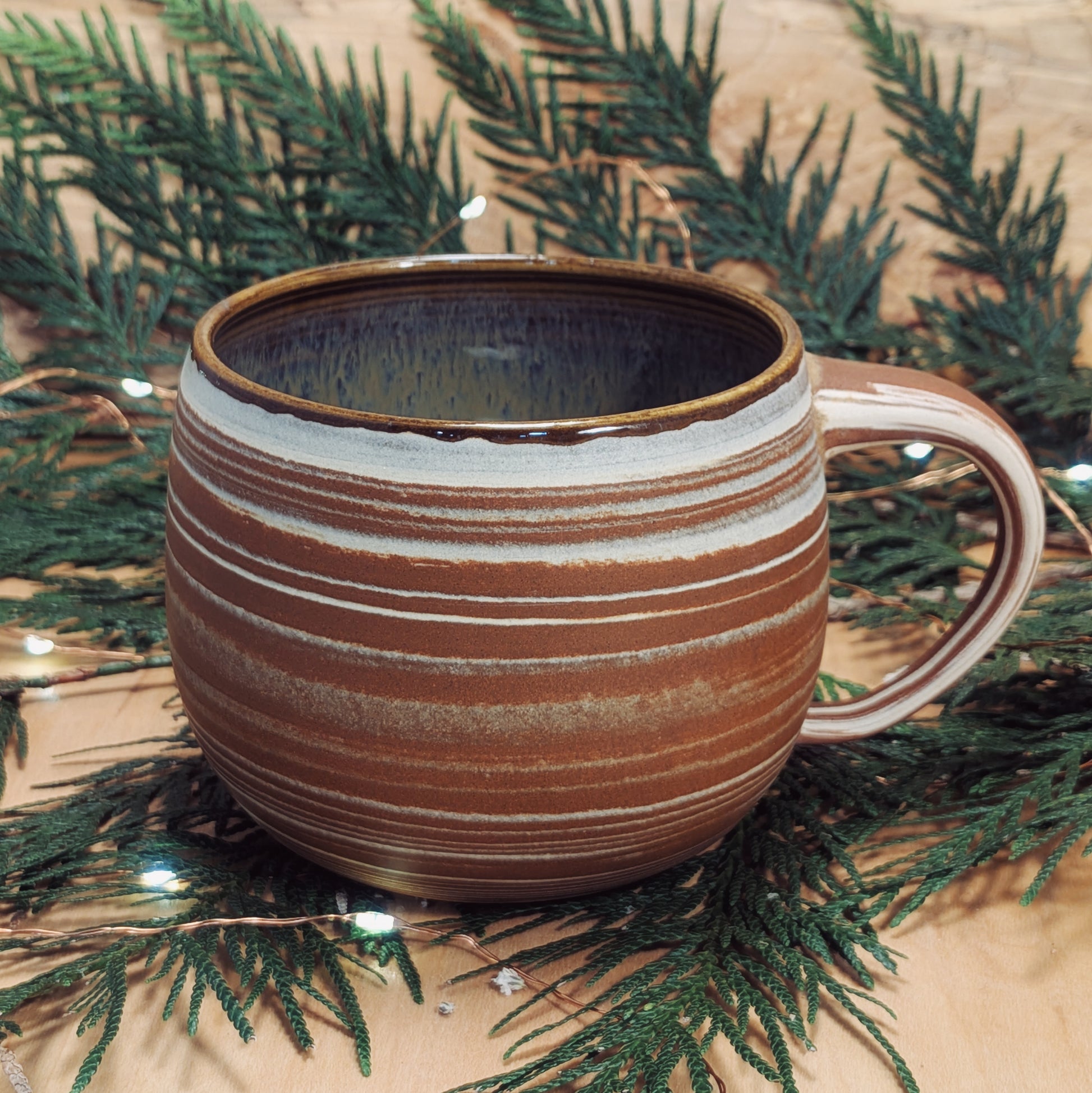 Made of a mix of stoneware clay, marbled together on the pottery wheel. Exterior is bare clay which has been burnished smooth.