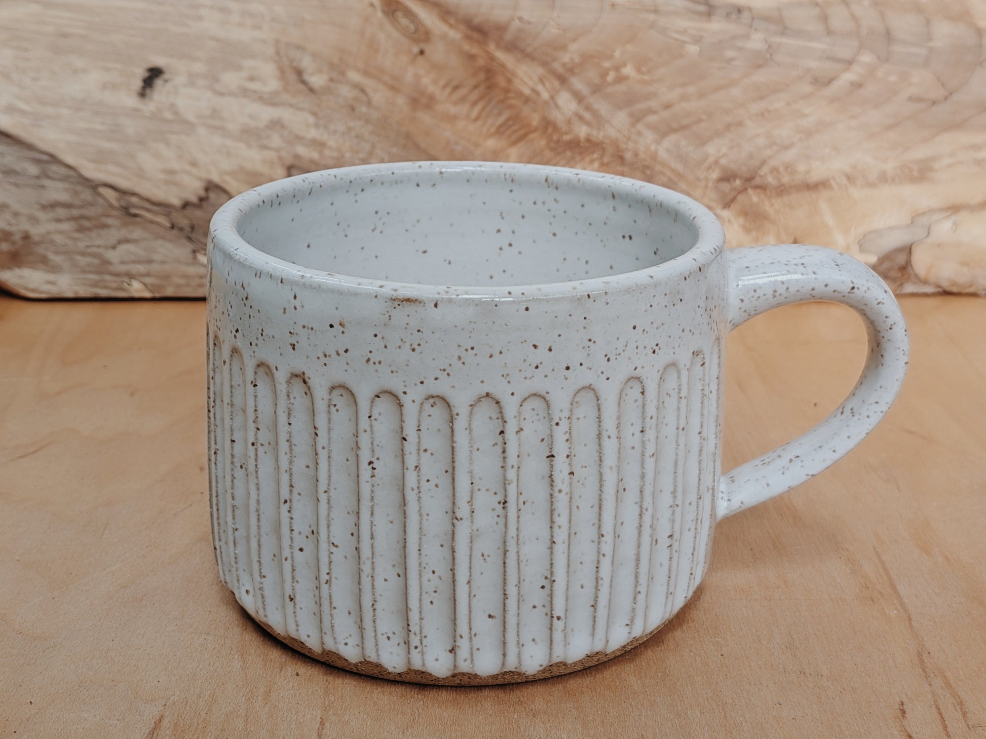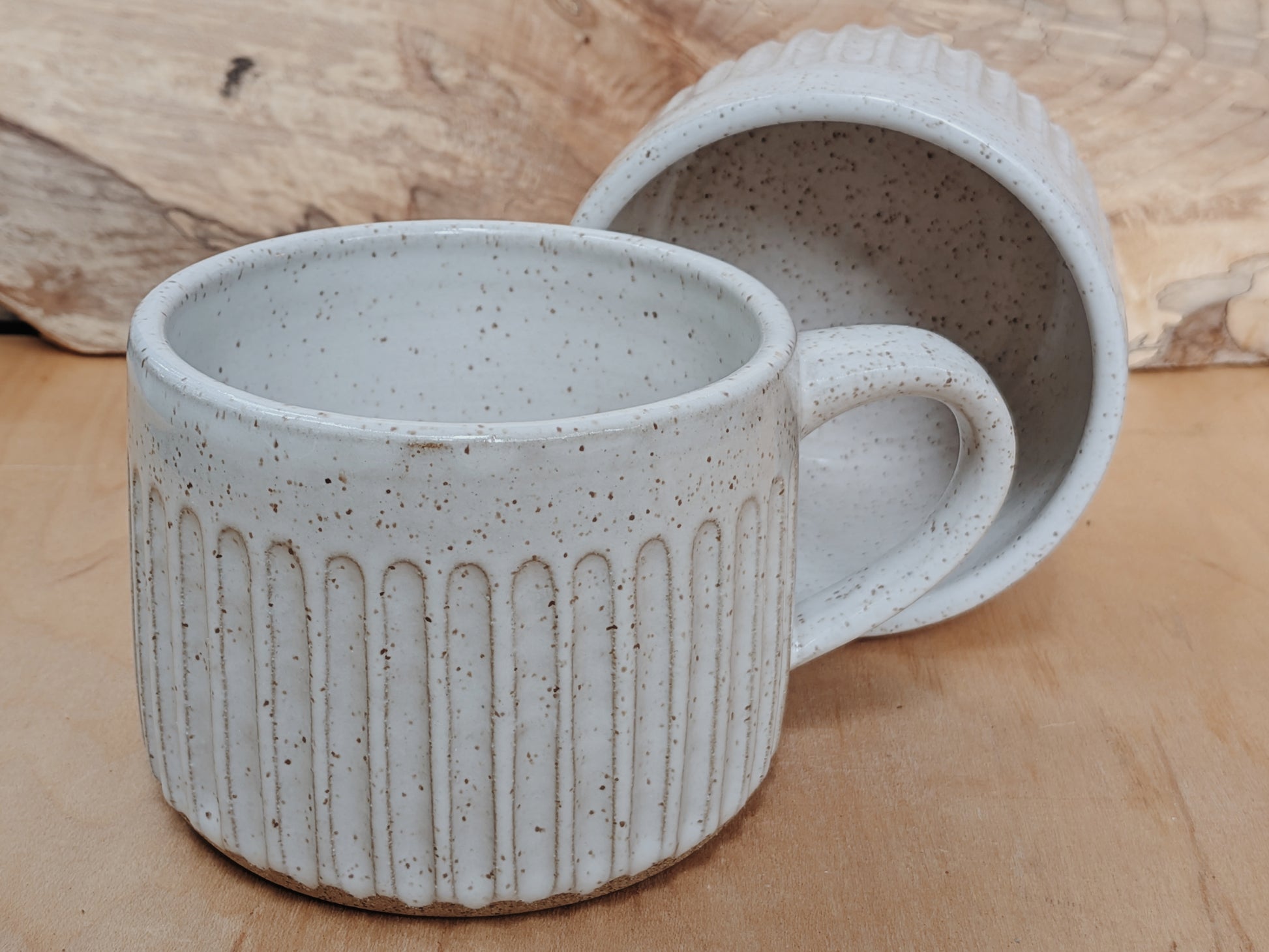 Made of a speckled buff stoneware with a fluted design and glazed glossy white.