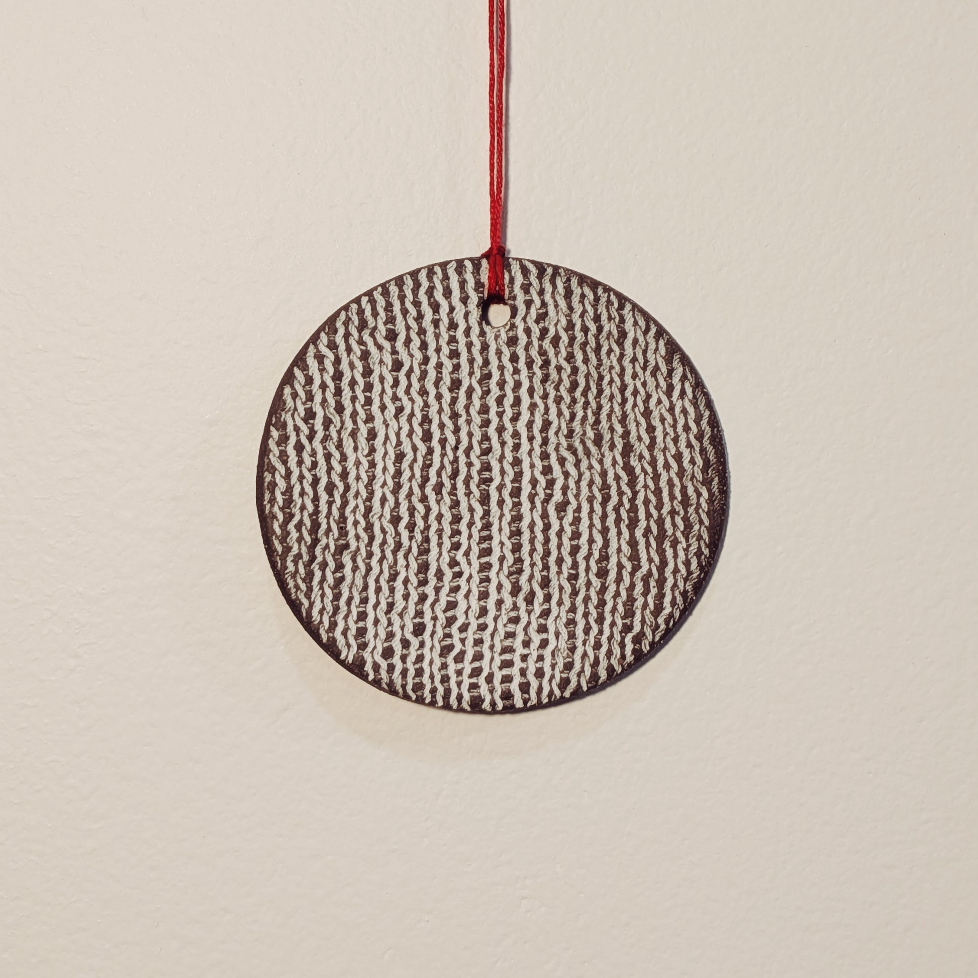 Made from a gingerbread brown clay and stamped with real plants. Hung on a red ribbon.