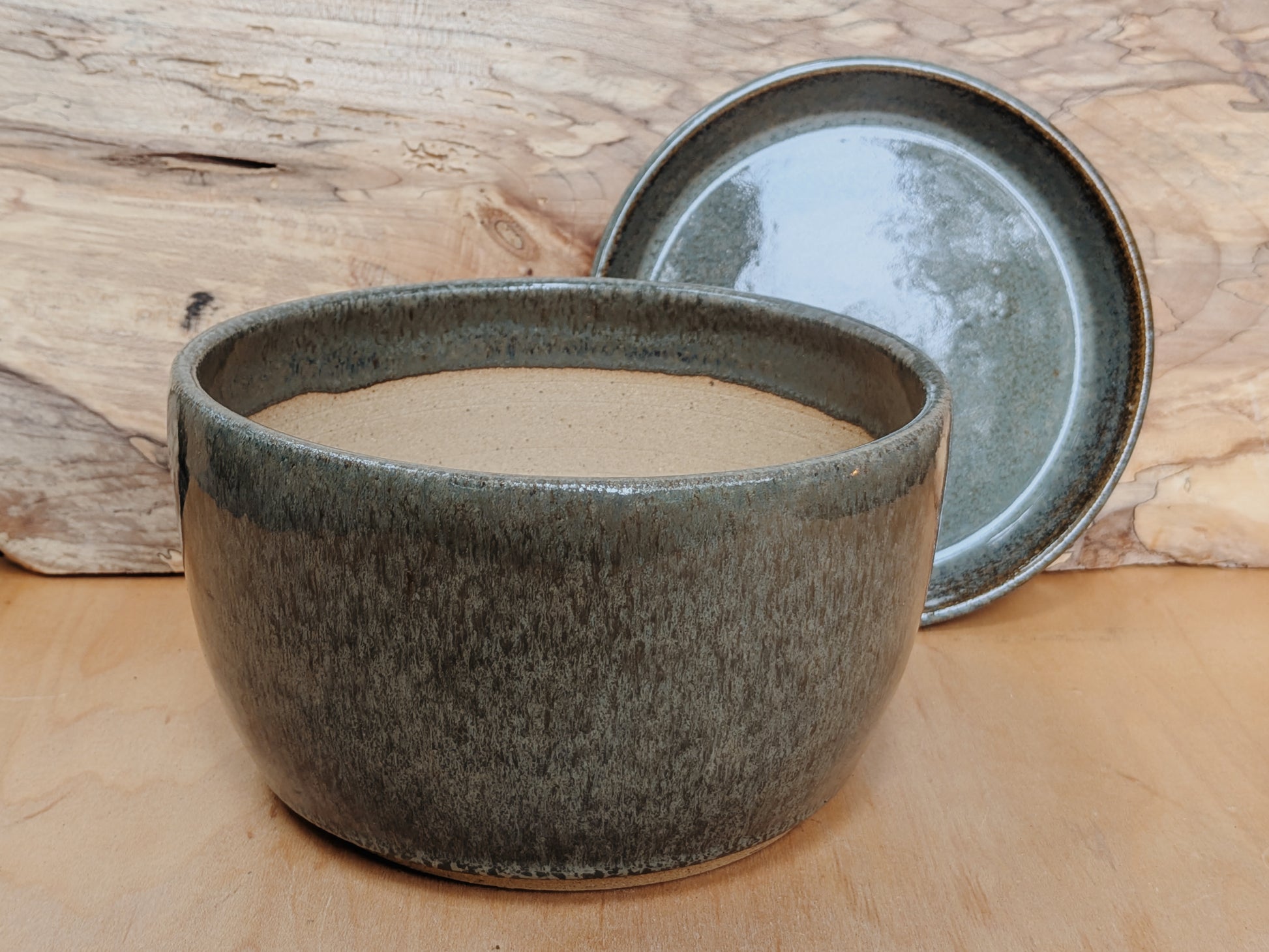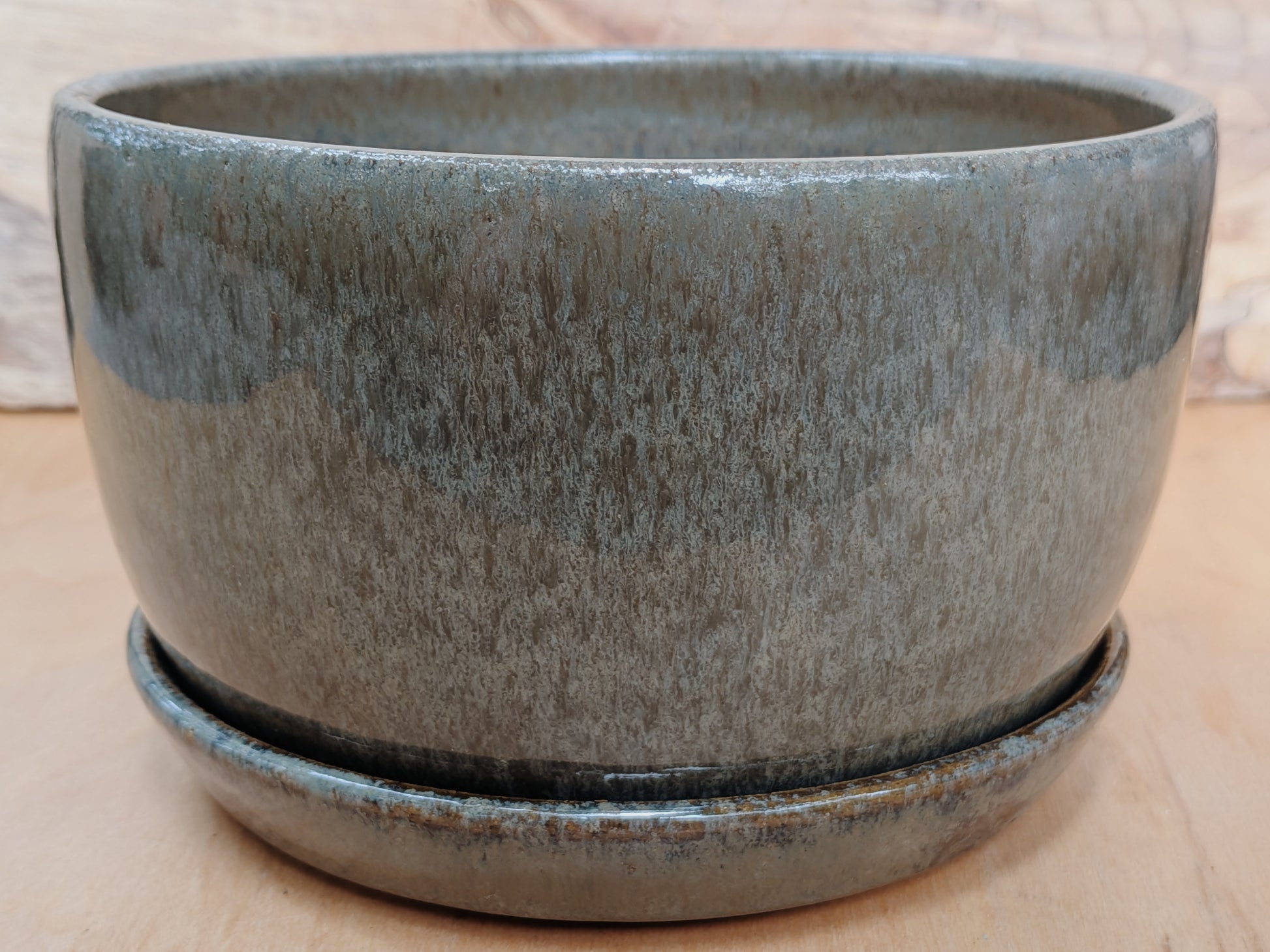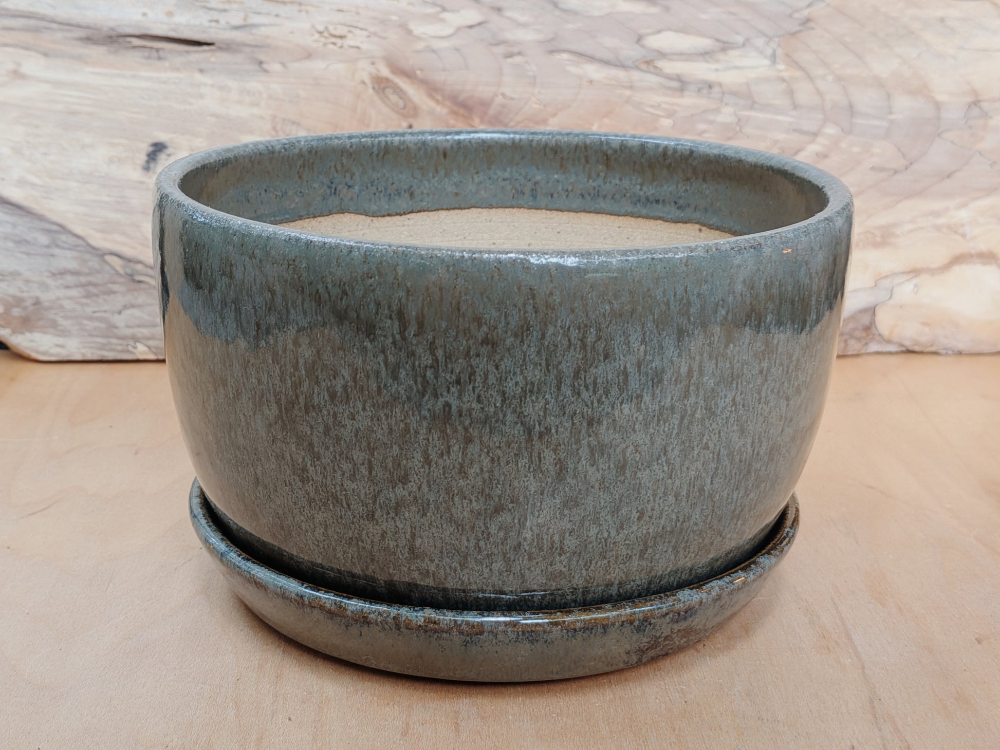 Plant pot and saucer made of buff colored stoneware clay and glazed a greyish blue.